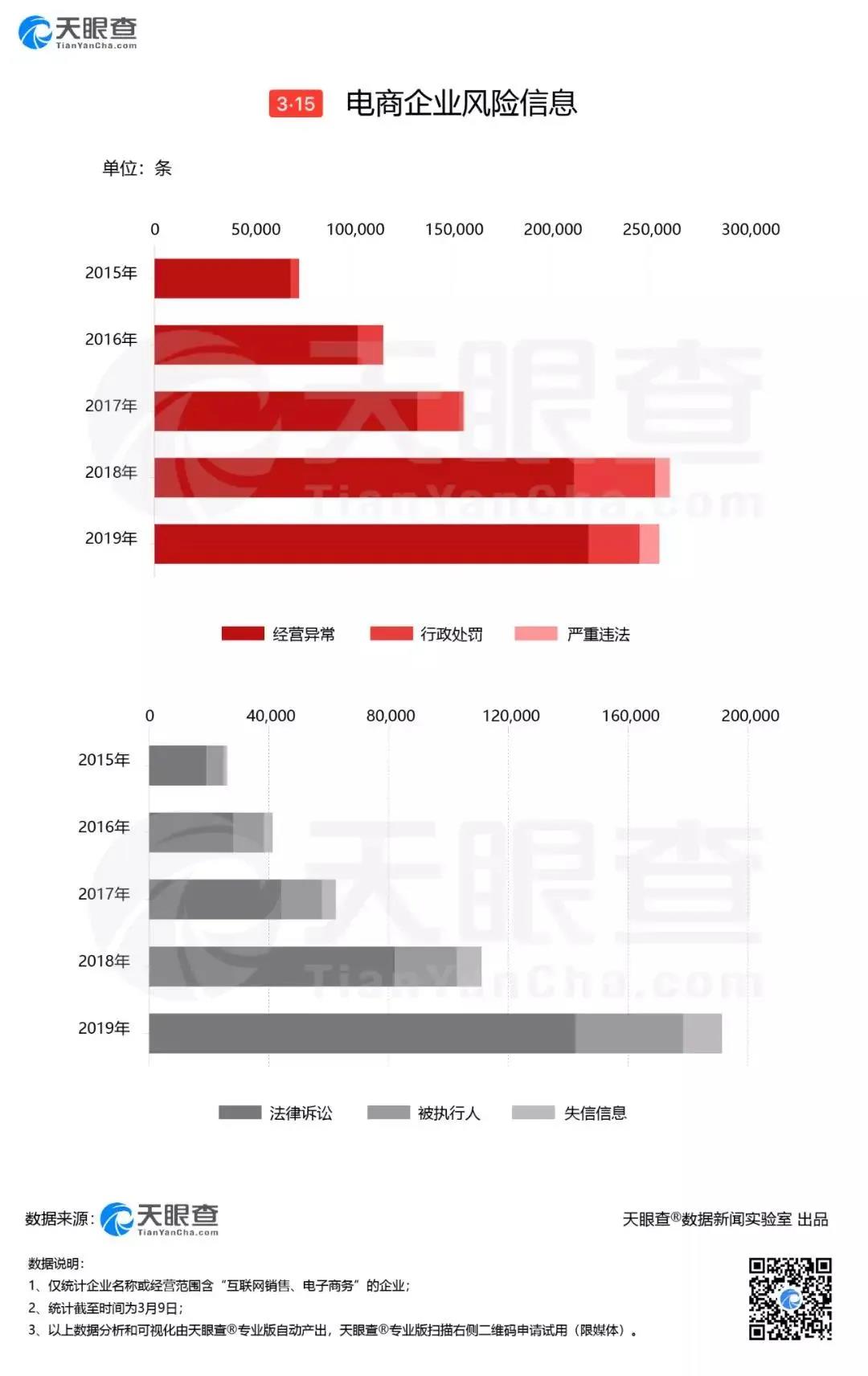 從司法風(fēng)險(xiǎn)來看,法律訴訟案件數(shù)量持續(xù)上漲,僅2019年就達(dá)14萬件。此外,電商企業(yè)近5年共產(chǎn)生8.6萬條被執(zhí)行人信息和超3萬條失信信息。
