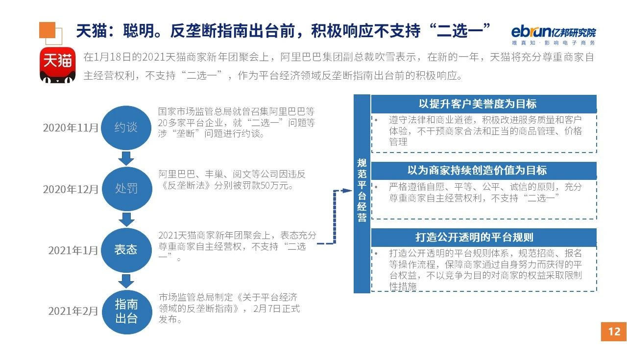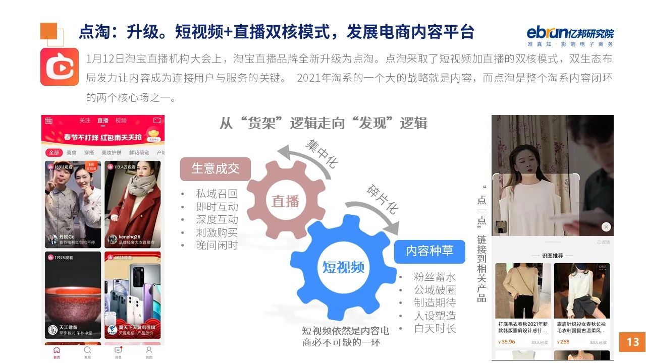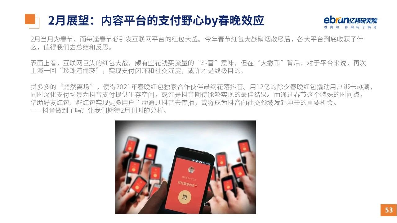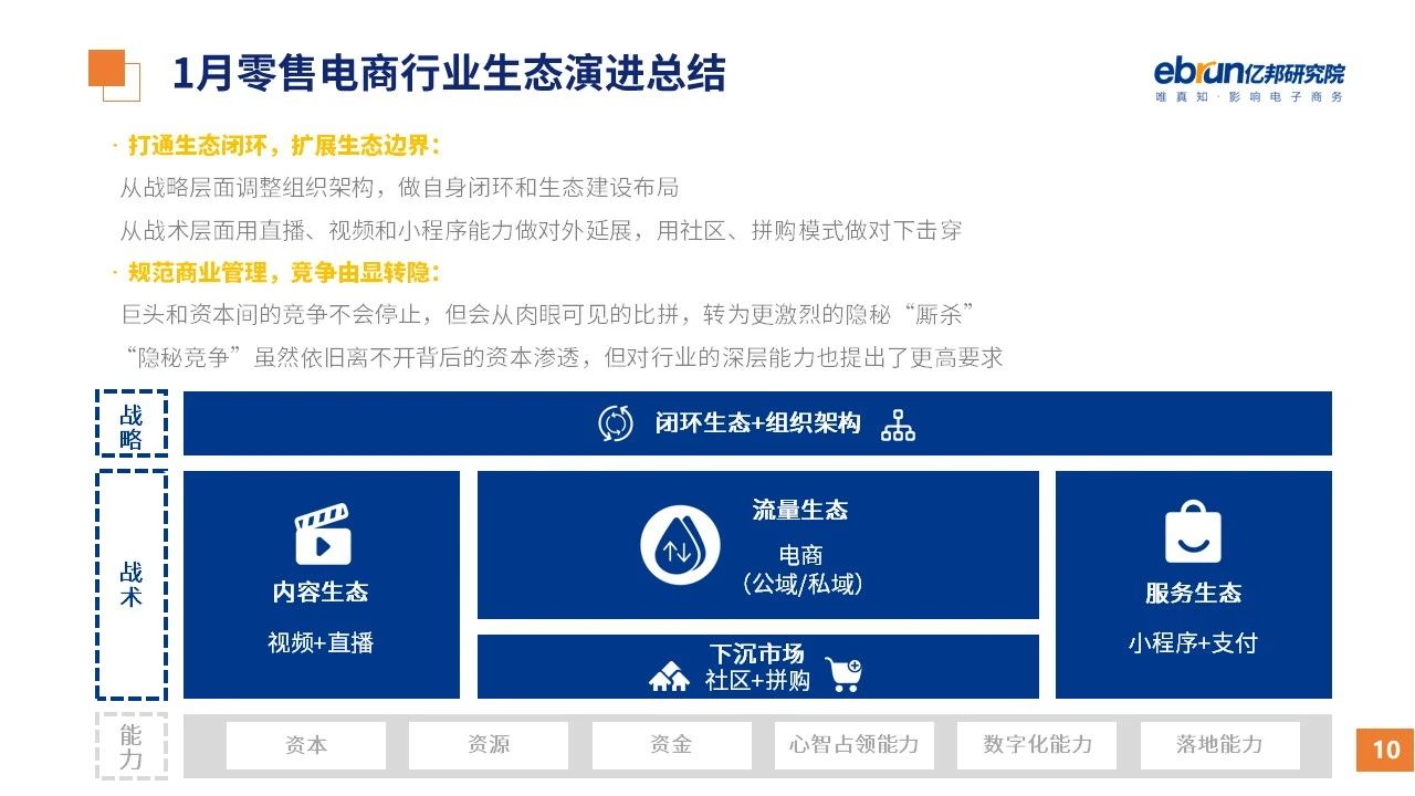 縱觀2021年1月,各平臺(tái)豐富自有生態(tài)布局,如淘寶直播(點(diǎn)淘)加入短視頻模式、騰訊重押視頻號(hào)、快手加碼電商和小程序、抖音推出支付等;視頻內(nèi)容成為各平臺(tái)未來重點(diǎn)發(fā)力方向;“九不得”新規(guī)發(fā)布后社區(qū)團(tuán)購(gòu)仍熱情不減;國(guó)家和市場(chǎng)對(duì)互聯(lián)網(wǎng)巨頭和電商相關(guān)消費(fèi)加大監(jiān)管力度……你信和不信,你知道和不知道的,都在這份億邦動(dòng)力研究院正式發(fā)布的